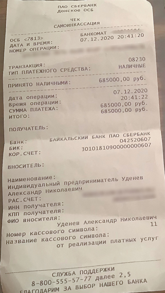 В чеке — получатель некий Александр Николаевич Уденев, индивидуальный предприниматель из Иркутской области, а счет получателя там же, в Байкальском отделении одного известного банка. Ниже напечатано и ФИО вносителя. И это не Мария Евгеньевна Витачек, а… Александр Николаевич Уденев. Получается, сам себе перевел 685 тысяч рублей. Это не чужой чек — установлено, что сумму внесла именно Мария Евгеньевна.
