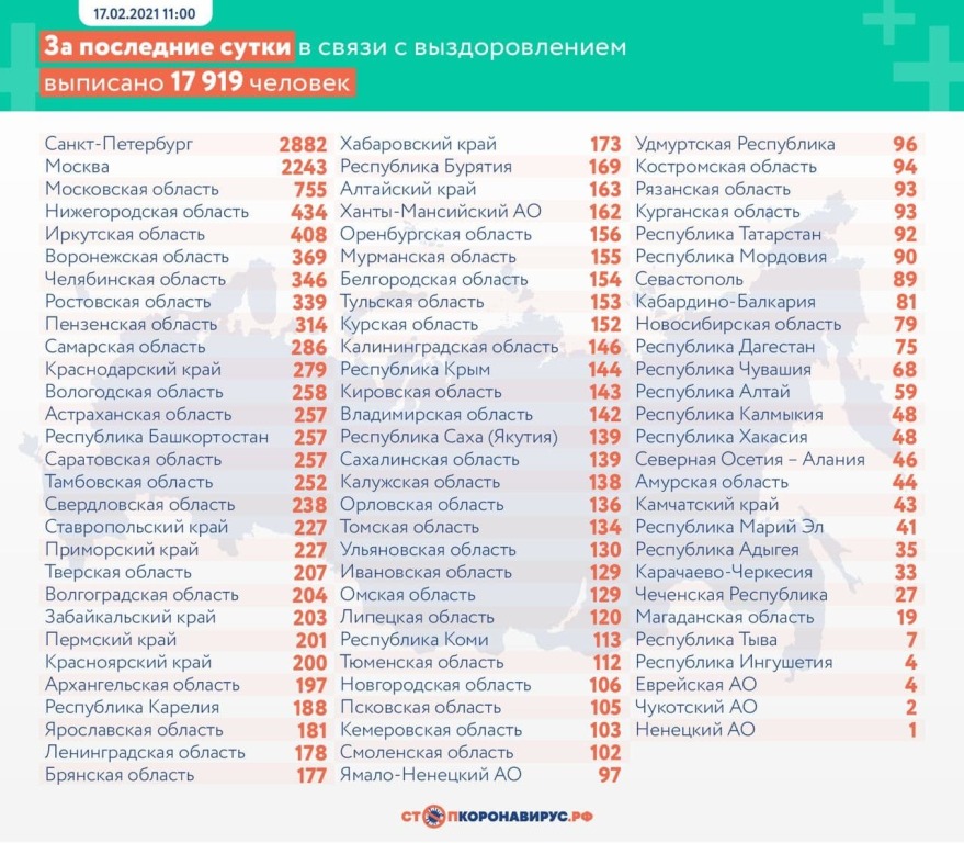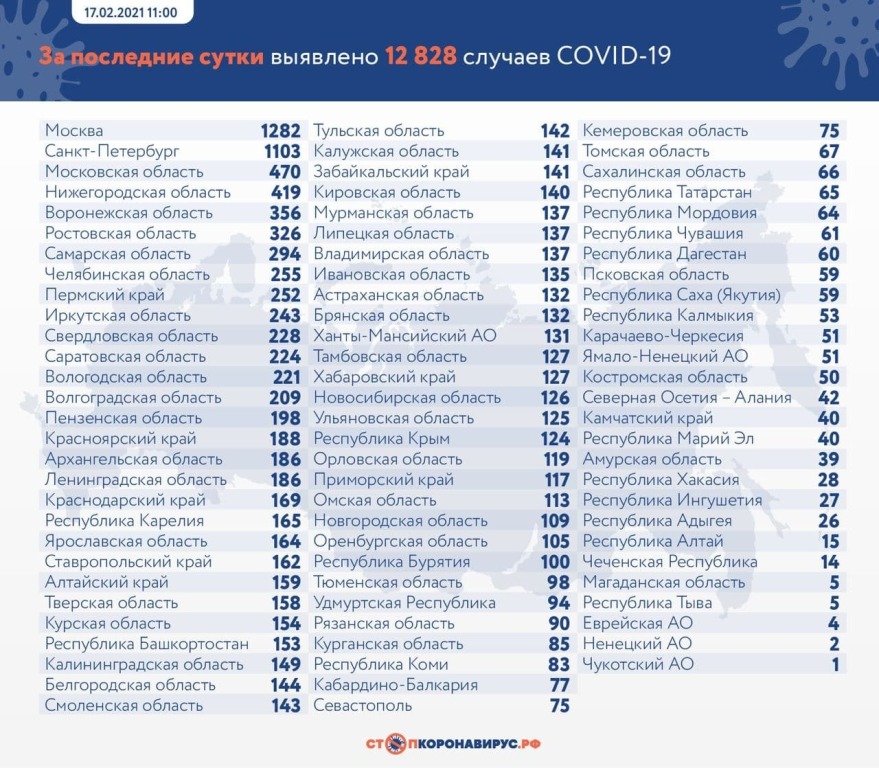За последние сутки по состоянию на 17 февраля 2021 года в России: