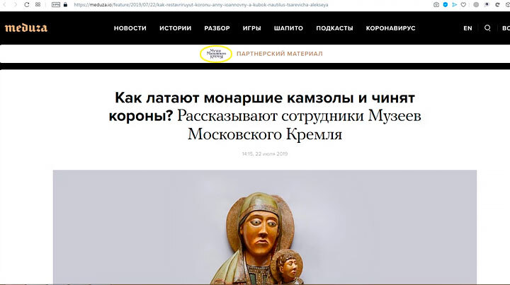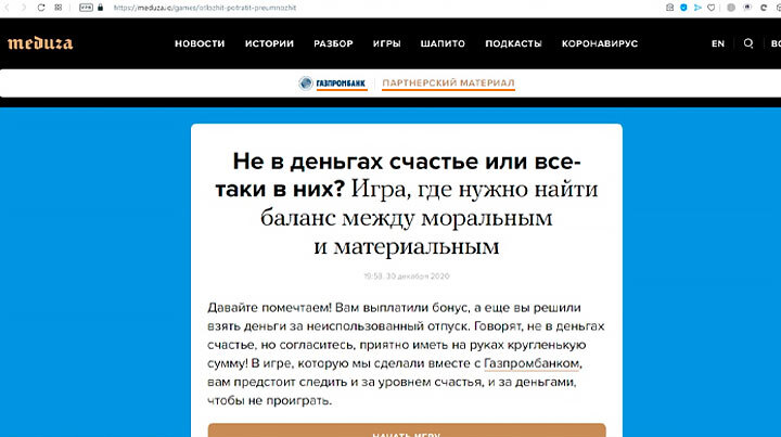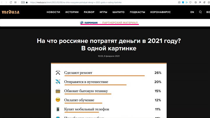 Но самое удивительное, что среди партнёров откровенно антироссийской Meduza есть российские госкорпорации и государственные учреждения. Так, например, издание получает деньги от "Газпромбанка", то есть от "Газпрома". Только за последний месяц "Газпромбанк" заказал у Meduza два материала под вполне нейтральными заголовками, но они явно носят рекламный характер. Один из них – интерактивная игра про бизнес и деньги, а второй – тест о предполагаемых тратах жителей России в 2021 году.