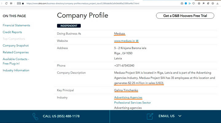 В международном реестре компаний D&B Business есть профиль Medusa Project SIA. В нём сказано, что компания является рекламной (об этой особенности мы расскажем ниже), её владельцем является Тимченко, а объём продаж составляет 2,25 млн долларов.