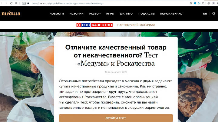 Однако спонсорскими отношениями с Meduza увлекается не только эта госкомпания. Заказные материалы это СМИ писало и для "Роскачества", которое мало того что было учреждено правительством России, так ещё и прямо финансируется из федерального бюджета.