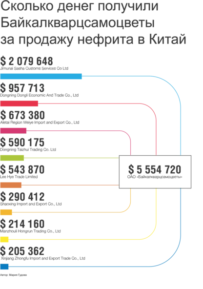 С 2013 по 2020 год восемь китайских компаний по контрактам с «Байкалкварцсамоцветами» получили больше 200 тонн необработанного нефрита на сумму $5,3 миллиона, по данным базы о внешнеторговых операциях ImportGenius. То есть средняя цена составила порядка $27 за килограмм необработанного нефрита.