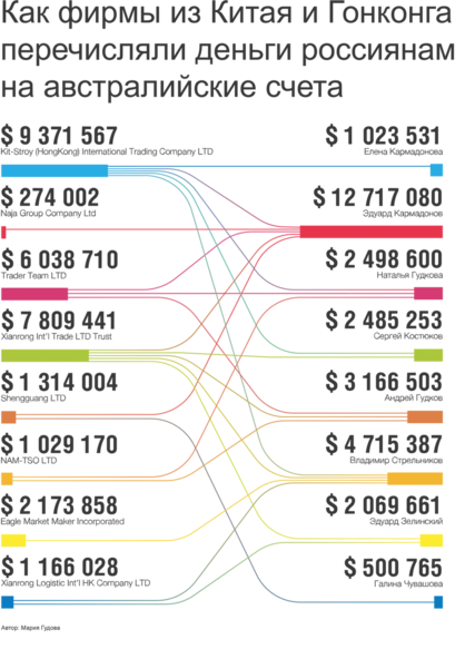 О финансовом скандале с девятью россиянами в Австралии стало известно еще в 2014 году. Как тогда сообщал «Коммерсантъ», предприниматели из Иркутска Андрей Гудков, Владимир Стрельников, Эдуард Кармадонов и Эдуард Зелинский, их жены, а также еще один их деловой партнер Сергей Костюков оказались в центре внимания австралийской федеральной полиции. Проблемы у них начались после того, как полиция заметила, сколько они тратили денег. Суммы не соответствовали задекларированным при получении австралийских виз доходам. В декларациях и приложенных документах предприниматели указали по несколько десятков тысяч долларов годового дохода каждый. Тем временем на их банковские счета в Австралии приходили миллионы из Китая и Гонконга.
