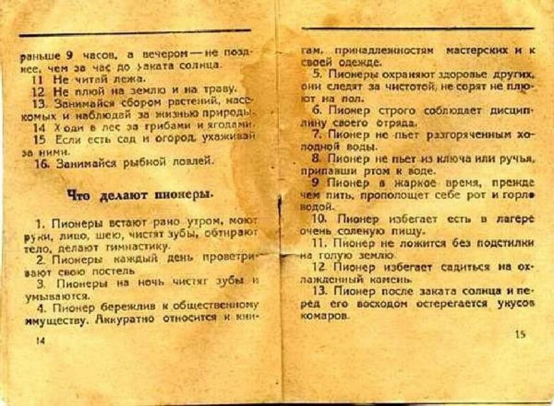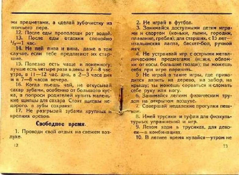 Самые интересные правила 1929 года. Они собраны в отдельную, довольно емкую, брошюру и включают в себя все рекомендации для школьников с момента пробуждения до отхода ко сну. В то время было много неграмотных родителей, была крайне низкая санитарная грамотность всего населения. Поэтому основной упор составители сделали не на «следование заветам партии», а именно на самые простые бытовые вещи.