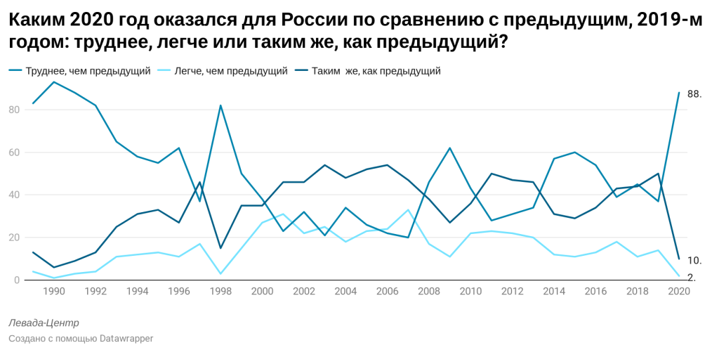 В целом исследование показало рекордный всплеск социального пессимизма. Нельзя сказать, что россияне всегда радовались итогам года, но сочетание пандемии коронавируса, экономического кризиса, снижения на протяжении 7 лет реальных доходов населения, ограничения политических прав и свобод в 2020 году дало такой результат.