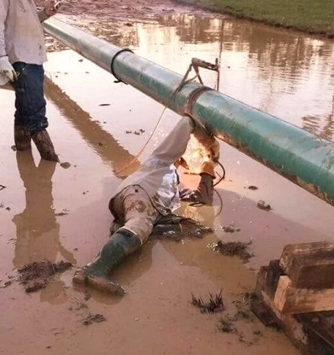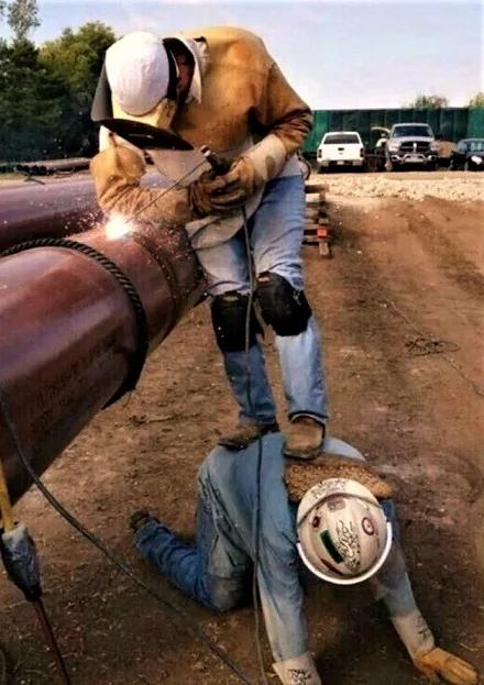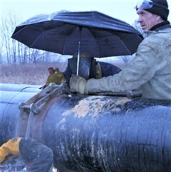 Настоящий друг не только зонт подержит, но и спину подставит. Когда нужно выполнять план, то нет времени бегать за стремянкой — работать нужно! Кстати, профессиональные сварщики, прокомментируйте, пожалуйста, происходящее на фото! Трубопровод — объект серьёзный, а случай не единичный. Почему так делают, чего не хватает на объекте?