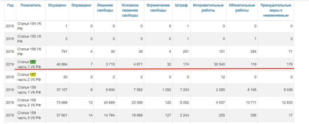 Но даже если смотреть на практику применения данной статьи, то мы увидим, что она не работает. По официальным данным Судебной статистики РФ в 2019 году по ст. 157 УК РФ было осуждено 46 864 человека, из которых к наказанию в виде лишения свободы было привлечено только 3715, остальные по большей части отделались исправительными работами.