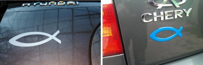 Так как рыба считается одним из символов Иисуса Христа, ранние христиане (да и современные тоже) использовали пиктограмму «ихтис», которая выглядит точь-в-точь как та самая рыбка на кузовах некоторых автомобилей. Судя по всему, в современном исполнении аксессуар был придуман американскими протестантами и продавался верующим в качестве одного из способов обозначить свою религиозную принадлежность. Следует также понимать, что человек, который ездит на машине с «ихтисом», вовсе не обязательно является христианином. Нередко украшение на кузове достается по наследству новому хозяину после перепродажи транспортного средства.