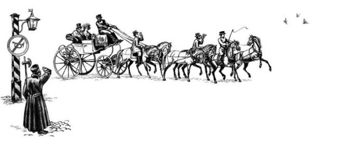 При Екатерине II определенные виды транспорта были закреплены за служащими разных чинов. Цугом (6-10 запряженных лошадей) с форейторами, предупреждавшими пешеходов, предписывалось ездить чиновникам первого и второго класса, а также генералам. Остальным же пользоваться живыми аналогами «мигалок» воспрещалось. Если переводить на наш язык, то условному Сергею Бордюровичу Собянину можно было ездить с мигалкой, а вот его непосредственным подчиненным – уже нет. Также была запрещена ночная езда с зажжёнными факелами – как частая причина пожаров. Дворянам без чина, для сравнения, полагалось выезжать только с одной лошадью.