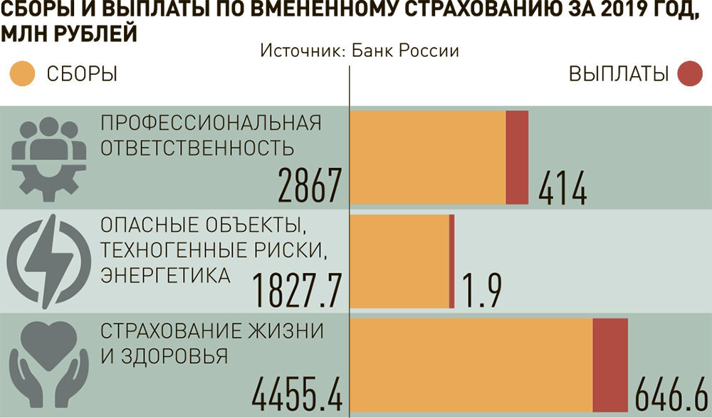 В России на федеральном уровне установлен 31 вид вмененного страхования ответственности, три вида - имущества, 27 видов - жизни и здоровья отдельных категорий граждан (из которых 16 видов осуществляются в отношении госслужащих). Общий объем собранных страховых премий по 45 видам вмененного страхования за 2017-2019 годы составил 43,7 млрд руб. (менее 10% всех премий страхового рынка), страховых выплат - 7,5 млрд рублей. Таким образом, доля выплат к собранным премиям (17,2%) по этим видам почти в два раза ниже, чем в добровольном (32,5%), и в четыре раза ниже, чем в обязательном (68,6%) страховании. В наиболее популярных добровольных видах показатель был на более высоком уровне: например, 52,6% в страховании наземного транспорта (кроме железнодорожного) и 72,8% в добровольном медицинском страховании.