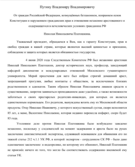 В данном обращении, которое подписали большое количество известных и уважаемых граждан России, в том числе деятели культуры: Меньшов, Бортко, Кончаловский, и многие другие - высказывалась просьба о реализации полномочий Президента в рамках Конституции РФ, а так же требование справедливого решения в отношении достойного, порядочного и, главное, ни в чём не виновного человека – Николая Николаевича Платошкина.