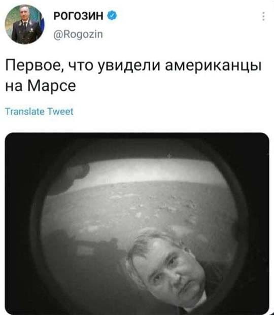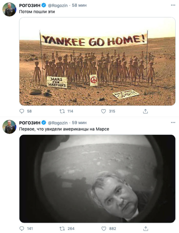 Генеральный директор госкорпорации «Роскосмос» Дмитрий Рогозин опубликовал в своем Twitter два мема после благополучной посадки марсохода американского космического агентства NASA на Марс.