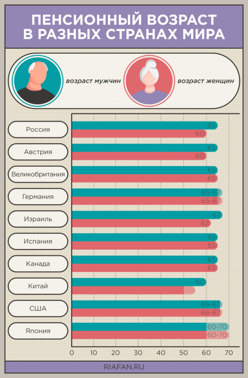 Повторим еще раз — ни о каком новом повышении пенсионного возраста в России сейчас речь не идет. Кстати, по этому показателю Россия занимает среднее положение среди развитых стран. Нынешний пенсионный возраст в России, которые постепенно повышают до 60 лет для женщин и до 65 лет для мужчин, полностью соответствует рекомендациям Всемирной организации здравоохранения (ВОЗ).