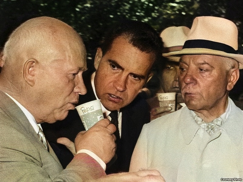 Никита Хрущев (слева) пьет пепси-колу, за ним наблюдает Ричард Никсон (в центре). Американская выставка в Москве, июль 1959 года.