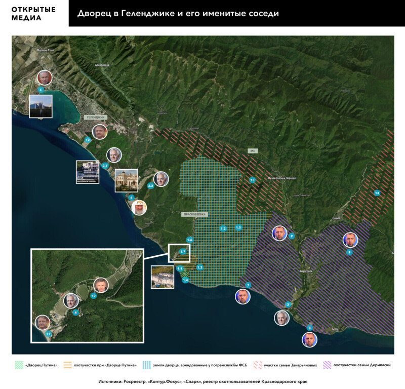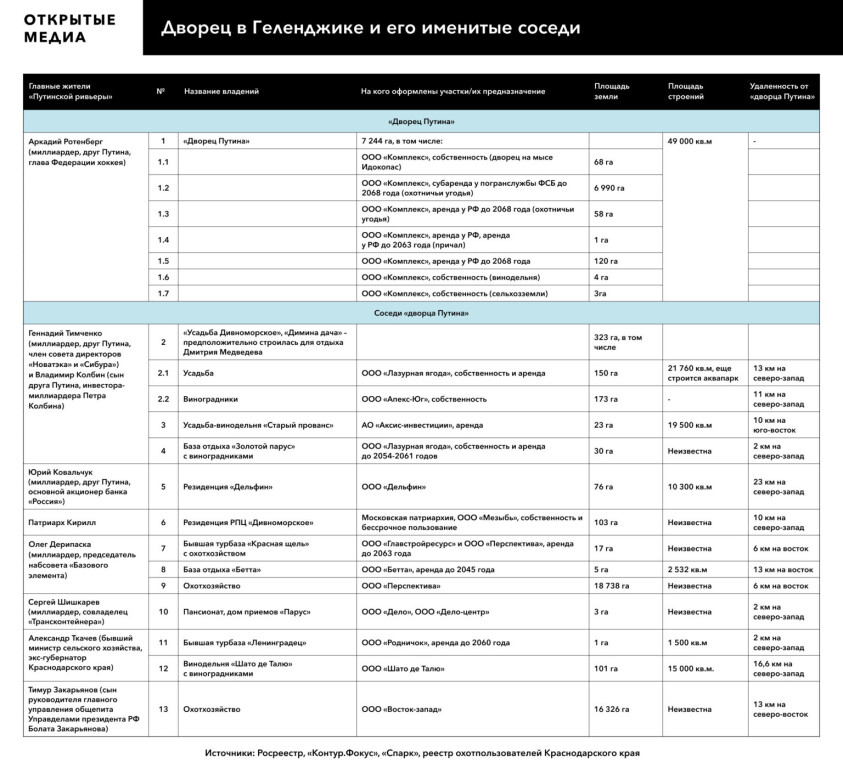 Владельцем «дворца Путина» официально признал себя Аркадий Ротенберг. В ближайшее время около дворца может начаться еще одна большая стройка — 119 гектаров выделены под охотничью базу. Рядом — усадьба «Дивноморское» площадью 323 гектара со спа-комплексом, винным заводом и дегустационным домом. Скоро там построят частный аквапарк. Принадлежит это все Геннадию Тимченко и Владимиру Колбину. Еще дальше — резиденция патриарха Кирилла, которая строилась как духовно-культурный центр. Внутри нее — крытый бассейн и 70 гектаров виноградников, а также винодельческое хозяйство. Все это стоит около 22 миллиардов рублей. Через лес от «дворца Путина» — две турбазы семьи Олега Дерипаски на 7 миллиардов рублей, а также арендованные им охотничьи угодья на десятки тысяч гектаров, которые никто из экспертов не взялся оценить. Ближайший сосед «дворца Путина» — это база «Парус», которой владеет Сергей Шишкарев. Только сам участок — без строений, о которых ничего не известно — стоит около 1,2 миллиарда рублей. В самом Геленджике есть резиденция Юрия Ковальчука площадью 70 гектаров и стоимостью 11 миллиардов рублей. У главного здания (6752 квадратных метра) — бассейн на крыше и панорамные стеклянные стены.