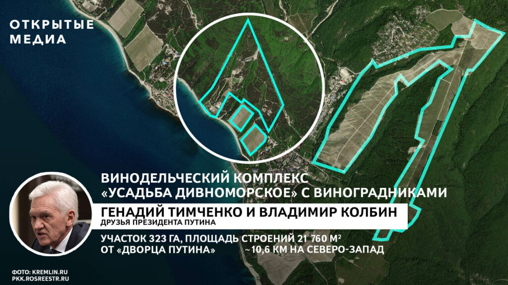В своём фильме «Дворец для Путина» Алексей Навальный показывает проект роскошного замка, якобы строящегося для президента рядом с Геленджиком. Хотя телеканал «Россия 1» через 10 дней после выхода расследования предъявил обществу бетонные стены (демонстрирующие отсутствие гламура) и нового собственника дворца Аркадия Ротенберга (демонстрирующего отсутствие Путина), объект по-прежнему выглядит величественным. Но в фильме Навального ничего не говорилось о том, что вокруг «путинского дворца» уже выросли как грибы не менее роскошные и охраняемые усадьбы, тоже почти дворцы — они принадлежат людям из ближайшего окружения президента. На сам дворец и прилегающие к нему винодельни, по данным Навального, потрачено 100 млрд рублей, но и соседские поместья по самым скромным оценкам стоят десятки миллиардов рублей. Корреспонденты «Открытых медиа» объехали окрестности дворца и с помощью сотен выписок из Росреестра и рассказов местных жителей составили путеводитель по «Путинской ривьере» — если будете в Геленджике, обязательно воспользуйтесь им. Сейчас мы расскажем, кого из «новых дворян» стоит посетить. 👉 Новости, которые мы узнали, составляя этот путеводитель: В ближайшем будущем окрестности дворца станут ещё роскошнее. На территории «Усадьбы Дивноморское», которую называли «Диминой дачей», строится аквапарк — но не для туристов, а для владельцев этого «закрытого объекта» (👉 см. главу II). Примерно через год к удобствам усадьбы вроде трубопровода с вином (из подвалов в дом приёмов) добавятся водные развлечения. При дворце появится огромная охотничья база — в прошлом году владельцу резиденции выделили участок в 119 га посреди особо охраняемых лесов (👉 см. главу I). Семья Олега Дерипаски ещё больше приблизилась к дворцу, выкупив по соседству, в Красной щели, советскую турбазу на берегу и арендовав лес вокруг неё. Всего же у семьи в аренде — десятки тысяч га охотничьих угодий к востоку от дворца (👉 см. главу V).