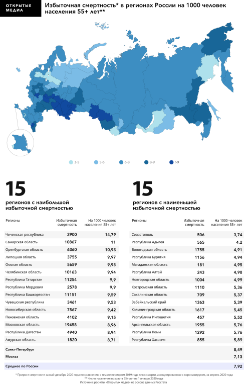 «Открытые медиа» в декабре 2020 года первыми предсказали, что из-за пандемии коронавируса рост смертности в стране окажется самым высоким за многие десятилетия. Вышедшие в феврале предварительные данные Росстата это подтвердили: в стране за прошлый год зарегистрировано на 18% больше смертей, чем в 2019 году. Выше прирост смертности был только в тяжёлом послевоенном 1947 году. Теперь мы убедились, что большинство регионов в течение года пытались скрыть огромную избыточную смертность. В 33 из 85 российских регионов избыточная смертность не менее чем в 10 раз превысила число официально признанных смертей от коронавируса, ещё в 40 регионах — более чем в три раза, подсчитали «Открытые медиа». Избыточная смертность — прирост смертей по сравнению с предыдущим годом, в нашем случае с маем-декабрем 2020 года, с учётом умерших от ковида за апрель. Самый большой разрыв — в Башкортостане, Татарстане, Сахалинской области, Чечне и Мордовии. Это позволяет судить о масштабе занижения данных о жертвах пандемии в сводках оперативных штабов. Именно по ним власти оценивают эпидемиологическую обстановку в стране. Например, в Башкортостане власти сообщили о 145 умерших от COVID-19 в 2020 году (для сравнения в сопоставимой по численности населения Ростовской области зарегистрировали 2077 умерших от коронавируса). При этом, по данным Росстата, в Башкортостане за май-декабрь 2020 года умерло на 11 151 человека больше, чем за аналогичный период 2019 года (мы также учли умерших от COVID-19 в апреле 2020 года). То есть избыточная смертность оказалась в 76,9 раза выше официальных данных о жертвах коронавирусной инфекции. В соседнем Татарстане избыточная смертность в 60,5 раза больше официального числа умерших от COVID-19 — 11 254 против 186. В Сахалинской области — превышение в 42 раза, в Мордовии — в 27 раз и т. д. Ещё один регион, сильно занижавший данные по числу умерших от коронавирусной инфекции, — Чечня (в 31,2 раза, 2900 против 93) — стал антилидером по приросту смертности в 2020 году. За май — декабрь 2020 года число умерших в этой северокавказской республике выросло на 71,4% по сравнению с тем же периодом прошлого года. В Чечне оказался и самый высокий показатель смертности на 1000 человек в возрасте 55+ лет — 14,79. Именно на эту возрастную группу, по оценке «Открытых медиа», приходится почти 90% смертей от коронавирусной инфекции. В Чечне при этом одно из самых молодых населений среди регионов России: в возрасте 55+ лет здесь находится чуть более 13% населения, для сравнения: в возрастных регионах — Тульской и Тамбовской областях — на эту возрастную группу приходится около 35% населения. Кроме Чечни, антилидерами по приросту смертности в мае-декабре 2020 года стали также другие «молодые» регионы — Дагестан (+51,2%), Ингушетия (+43,7%), Ямало-Ненецкий автономный округ (+41,6%) и Ханты-Мансийский автономный округ (+39,4%), а отнюдь не «возрастные» регионы. При этом другие «молодые» республики — Тыва, Алтай и Бурятия — наоборот, находятся в группе регионов с самым низким приростом смертности. Независимый демограф Алексей Ракша считает, что сильный рост смертности в Дагестане, Ингушетии и Чечне связан с традициями и обычаями местных сообществ, жизни большими семьями и устраиванием массовых собраний, особенно в помещениях, в том числе во время пандемии. По его мнению, увеличение числа умерших в ЯНАО и ХМАО объясняется работой вахто