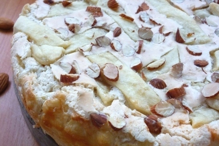 Перед тем, как распределять миндальную массу по поверхности пирога, ее нужно охладить до комнатной температуры. Массу нанести на тесто ровным слоем.