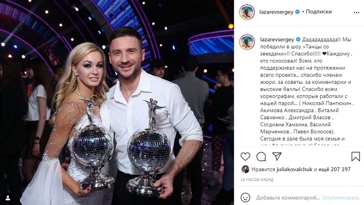 «Дададададада! Мы победили в шоу «Танцы со звездами»! Спасибо! Каждому, кто голосовал!» – написал Лазарев, поблагодарив за поддержку всех, в том числе жюри и хореографов.