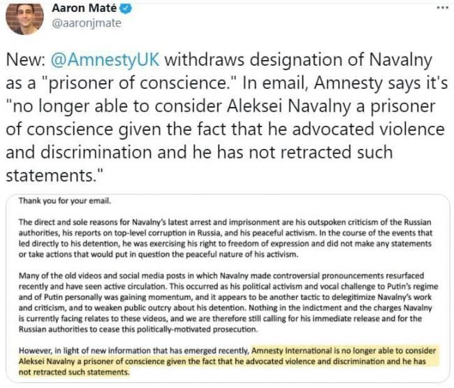 О чем обсуждать компания против опозиционера Навального на государственном уровне. А что касается Международной правозащитной организация Amnesty International , которая отказалась считать Навального «узником совести»-это " правозащитники" просто куплены и не представляют объективно положение внутренней политики в России-из Лондона не видно, ну пускай какой-то журналюга пускает слюнявые пузыри...