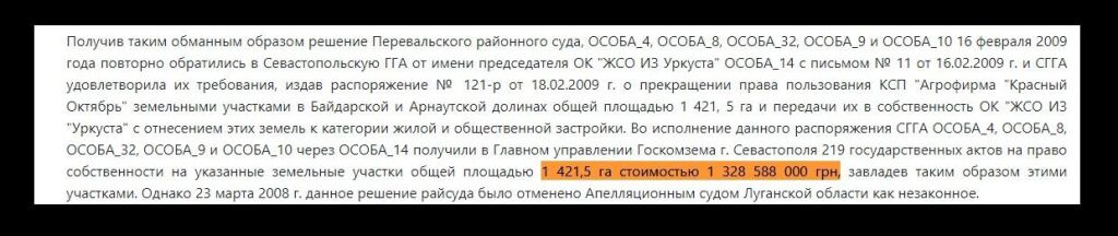 Особа №1 до особа №84, вроде столько я насчитал махинаторов этого дела. Возможно и до сих пор живут среди нас в Байдарской Долине и городе Севастополь. К сожалению не нашёл в этих делах и на других источниках фамилии людей причастных к такому "распилу" Байдарской и Арнаутской долин. Есть только косвенные факты мошеннических дел, да разговоры "сарафанного" радио, указывающие на конкретные фамилии. Прямых доказательств нету, поэтому фамилии не выкладываю.