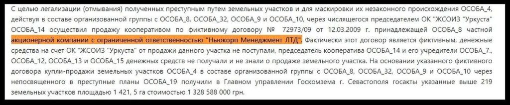 "С целью легализации (отмывания) полученных преступным путем земельных участков и для маскировки их незаконного происхождения ОСОБА_4, действуя в составе организованной группы с ОСОБЫ* осуществил продажу кооперативом по фиктивному договору № 72973/09 от 12.03.2009 г. принадлежащей ОСОБА_8 частной акционерной компании с ограниченной ответственностью "Ньюкорп Менеджмент ЛТД". Фактически этот договор является фиктивным, денежные средства на счет ОК "ЖСОИЗ "Уркуста" от продажи данного участка не поступали, На основании указанного фиктивного договора купли-продажи земельных участков ОСОБА_4 в составе организованной группы с ОСОБЫ* через непосвященного в преступные планы ОСОБА_19 получили в Главном управлении Госкомзема г. Севастополя госакты указанные выше 219 земельных участков площадью 1 421, 5 га стоимостью 1 328 588 000 грн."