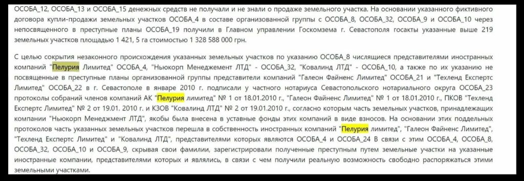 Название: " Пелурия лиметед" это офшор! Это можно найти в середине документа, об этих махинациях. Как его зарегистрировали и как выдали доверенность на ОСОБА №4 (или всё же на Особа №?).
