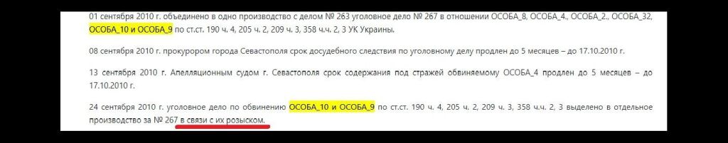 24 сентября 2010 г. уголовное дело по обвинению ОСОБА_10 и ОСОБА_9 по ст.статья 190 часть 4, 205 ч. 2, 209 ч. 3, 358 ч.ч. 2, 3 выделено в отдельное производство за № 267 в связи с их розыском.