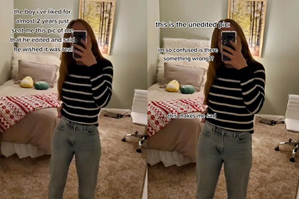 Блогерша опубликовала видео в TikTok и рассказала, как ее обидел молодой человек, которого она любила на протяжении нескольких нет. По ее словам, он прислал ей отредактированный кадр, на котором она выглядит худее, чем в реальной жизни, со словами: «Я бы хотел, чтобы ты была такой».