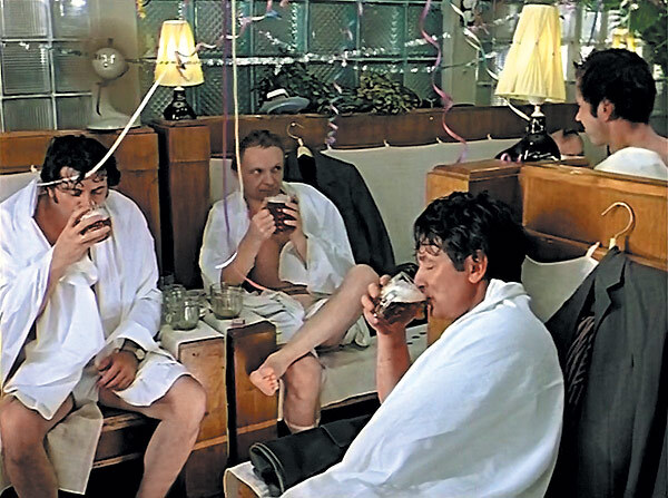 Эта история уже стала хрестоматийной, – рассказывает Ширвиндт. – «Банные» сцены мы снимали поздней ночью в холодном павильоне «Мосфильма», а вовсе не в Сандунах, как многие думают. Из настоящей бани нам привезли лишь две бочки настоящего пива и пальмы в кадках. А поскольку было холодно, и был день рождения у Саши Белявского, каждый из нас принёс с собой по бутылке сорокаградусной. Этими бутылками мы заменили бутафорские и сложили их к Жоре Буркову в портфель. Так что в кадре мы пили по-настоящему. Конечно, после очередного дубля мы здорово захмелели, и Рязанов, заметив это, съемку прекратил. На следующий день мы сыграли несколько дублей трезвыми. Однако в фильм попал тот, который отсняли именно в первую ночь!