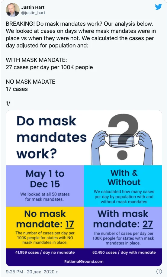 В Штатах есть такая контора RationalGround.com — центр обмена данными о COVID-19. Так вот, они решили подсчитать, как обстоят дела с заболеваемостью в тех штатах, где ношение масок было обязательным, и в тех, где ношение масок не требовалось. Исследование это предполагалось осуществить в целях доказательства эффективности масок. Но что-то пошло не так и, как это часто бывает, хотели как лучше, а получилось как всегда.