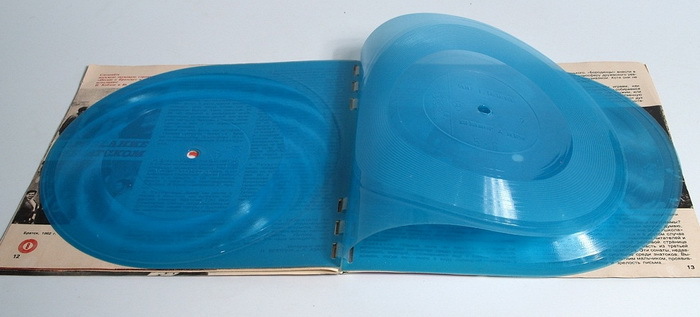 Помимо обычных виниловых выпускались и гибкие пластинки – их делали из ПВХ. Обычно такие диски можно было встретить между страницами некоторых советских журналов, в первую очередь «Кругозор» и «Колобок». Качество воспроизведения на такой пластинке было несколько ниже, зато и стоимость изготовления тоже оказывалась невысокой.