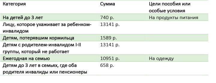 В эту группу входят 5 ежемесячных пособий, которые охватывают возмещение расходов в связи с удорожанием жизни, компенсации на одежду и другие выплаты.