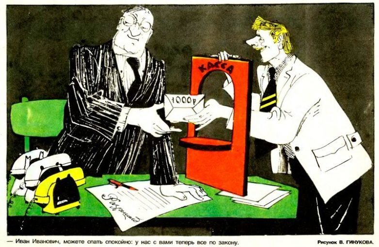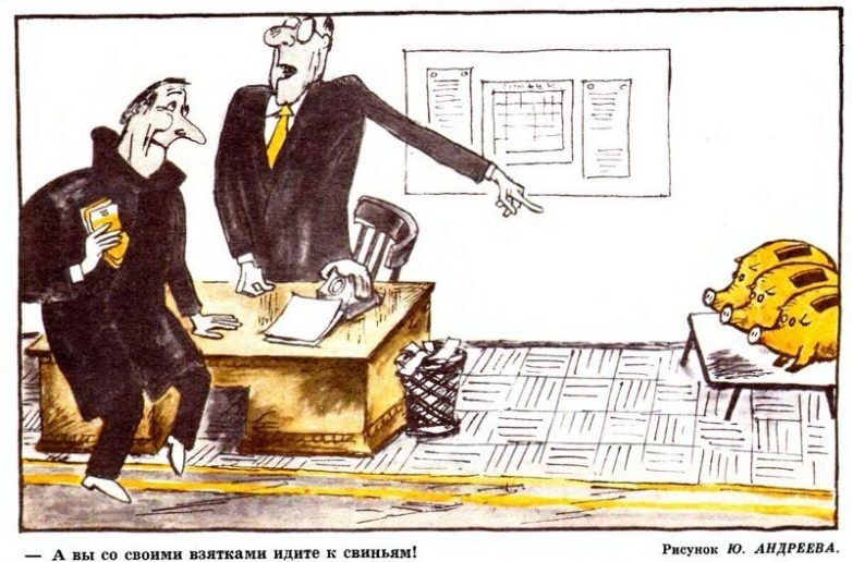 Нет уже сейчас таких карикатур, актуальны они раньше были, всё-таки боялись взятки брать и суммы были скромнее. Сейчас вся верхушка погрязла в коррупции берут не стесняясь прикрываясь семинарами и лекциями, потрепал языком на аудиторию, вспомнил калоши, пару миллионов в карман, оказал услугу — подготовил письмо, вот тебе и консультация — пол миллиона еще положил… клептократия процветает!