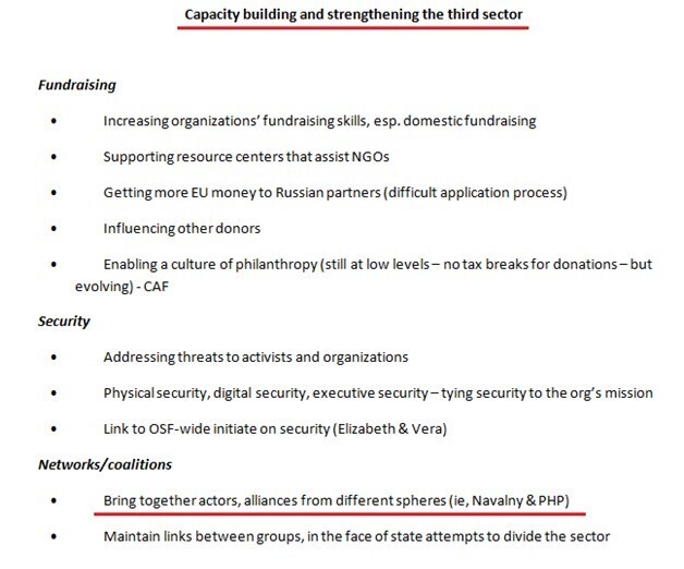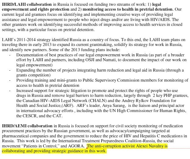 Сейчас в меня полетят шпалы, тапки, а толпа народу, вооружившись ссаными тряпками, попытается выгнать меня отсюда. Предполагая подобное развитие событий, скажу одно: я не претендую на истину в последней инстанции, но, если рассматривать приведённые ниже скрины различных документов и действовать. Итак, имеется достаточно доказательств, что в своё время, а точнее – в период с 2010 по 2013 год, Алексей Навальный курировал несколько проектов Института «Открытое общество», который имеет прямое отношение к знаменитым фондам Сороса. В 2015 же году, тысячи документов этого учебного заведения оказались в интернете, после прочтения которых начался настоящий холивар не только в мировой Сети, но и на полях сражений политических, ибо многие из документов посвящались установлению контроля США над целыми странами с подробным описанием процессов. К одному из таких относился и «Российский проект», которому Дж. Сорос хотел уделить отдельное внимание: проект был направлен (почему, собственно, был – он и сейчас есть) на дестабилизацию политического положения в стране и последующей смене власти на ту, которая будет выгодна США. Алексей Навальный был выбран как лицо, которому наиболее симпатизирует оппозиция (особенно в момент перед выборами в 2011 году) в России, и которому было поручено курировать несколько медицинских программ: PHP (Public Health Program), IHRD (Harm Reduction), LAHI (Law and Health) и AEMI (Access to essential medicines).