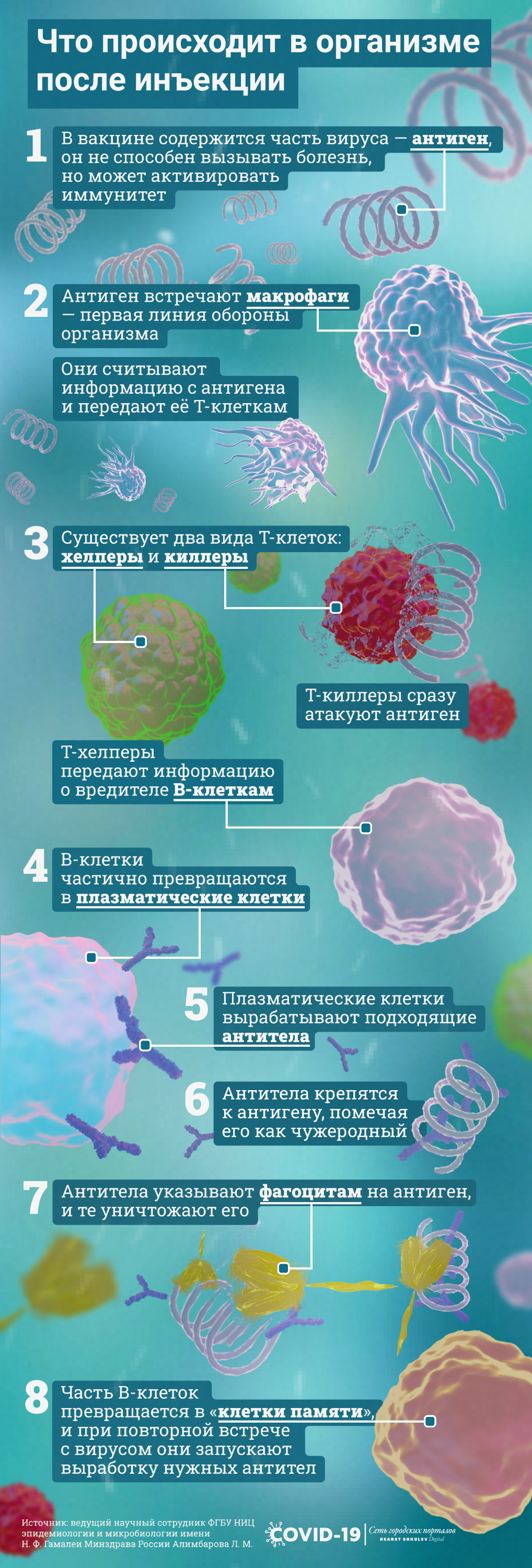 — Любая вакцина содержит специфический антиген — белок, который провоцирует выработку антител — иммунный ответ, — объясняет вирусолог Людмила Алимбарова. — В организме антиген встречают специально приспособленные для этого клетки — макрофаги. Они знакомятся с антигеном и считывают с него информацию. Полученную информацию они передают Т-лимфоцитам, те в свою очередь начинают изменяться, и среди них появляются клетки, которые также будут участвовать в иммунном процессе. Т-клетки передают информацию В-лимфоцитам, которые превращаются в плазматические клетки, способные продуцировать антитела. Часть В-лимфоцитов превращается в клетки памяти. Они хранят информацию об антигене и при повторной встрече с аналогичным антигеном запускают иммунный ответ (образование антител) в более короткие сроки.