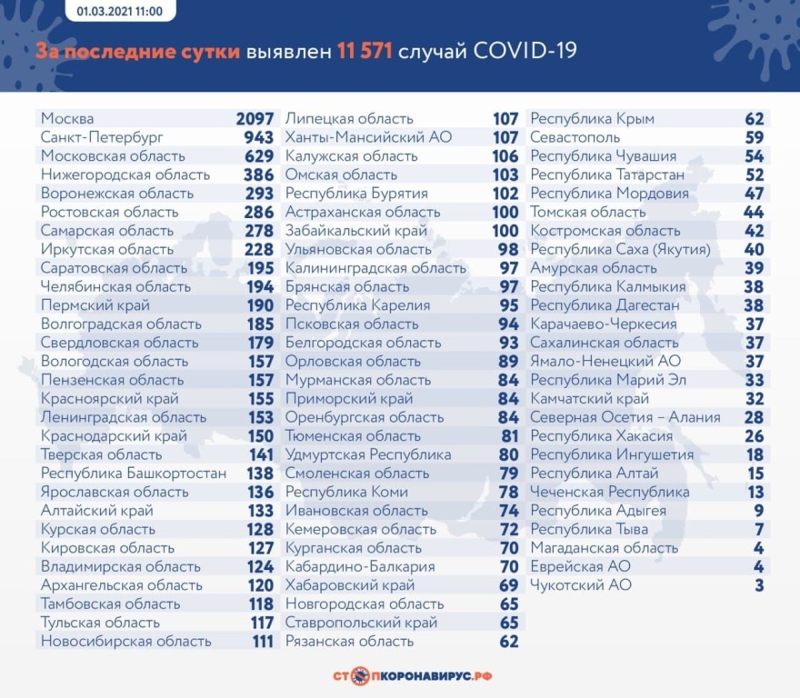 За последние сутки по состоянию на 1 марта 2021 года в России:
