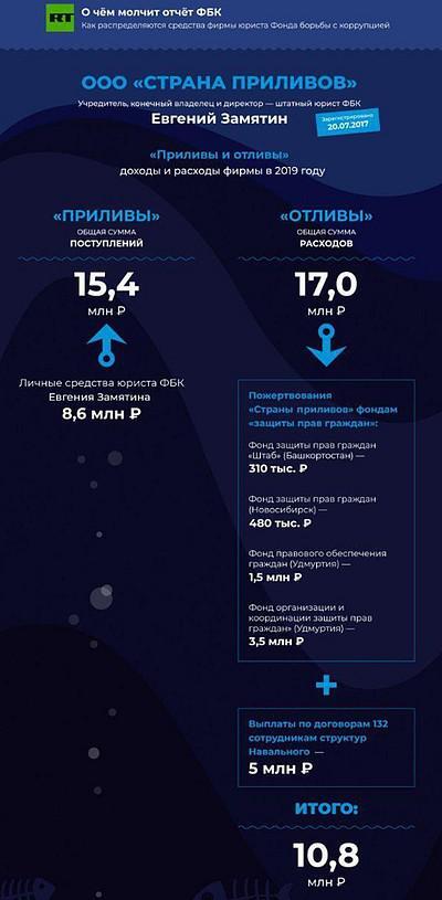 «В ФБК** ничего не меняется. Продолжается отмыв денег. Но они (сотрудники ФБК**. — RT) продолжают говорить, что им жертвуют по 500 рублей, — говорит юрист. — То есть ФБК** получает крупные суммы от «анонимных жертвователей», вносит их на счета компании, а та перечисляет их подконтрольным ФБК** фондам под видом пожертвований».