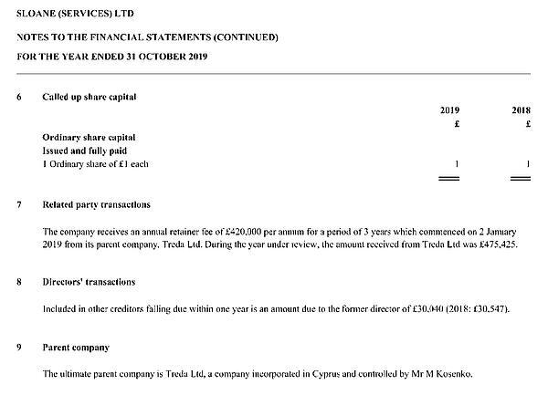 Согласно годовому отчёту Sloane Services, кипрский учредитель заявил о намерении платить дочерней компании сотни тысяч фунтов каждый год.