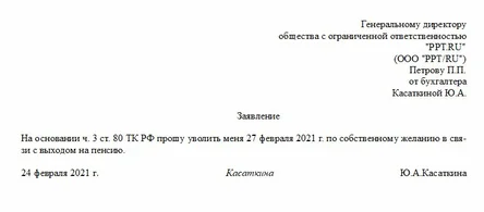 «Прошу уволить меня в связи с выходом на пенсию 24 февраля 2021 года».