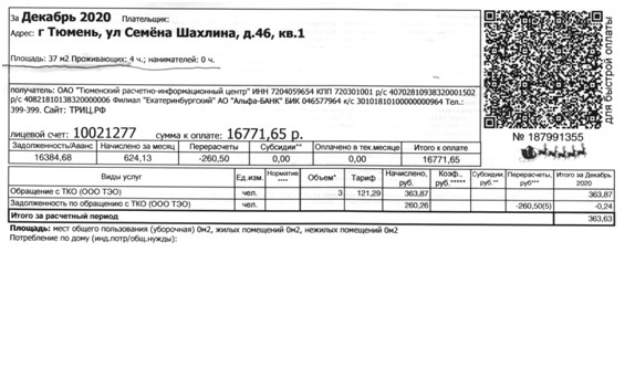 Переписка с администрацией города в течение более полугода и наша с Леной настойчивость дали положительный результат. Но, как оказалось, исчезнувший некогда по чьей-то вине дом успел «намусорить» на 16 771, 65 руб. Об этом гласит квитанция, поступившая в адрес Елены.