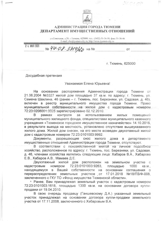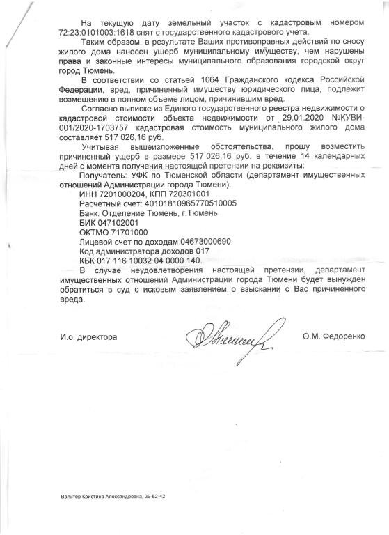 Вкратце напомню, что Елена в 2010 г. купила земельный участок, а через десять лет из департамента имущественных отношений администрации г. Тюмени ей пришло требование о выплате 517 026 руб. за самовольно снесённый муниципальный жилой дом площадью 37 квадратных метра. По логике администрации, муниципальный дом находился в «огороде» Елены, поэтому она должна быть «крайней».
