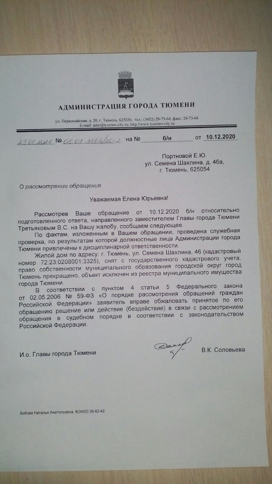 После очередного обращения на имя главы города Руслана Кухарука ответ последовал от его заместителя Соловьёвой В.К. 29 января 2021 г. Несмотря на то, что ответ является по-чиновничьи завуалированным, кратким и обтекаемым, суть в нём изложена. Заключается она в том, что муниципальный дом на земельном участке Елены исключён из реестра муниципальной собственности, а право собственности на него муниципальным образованием прекращено.