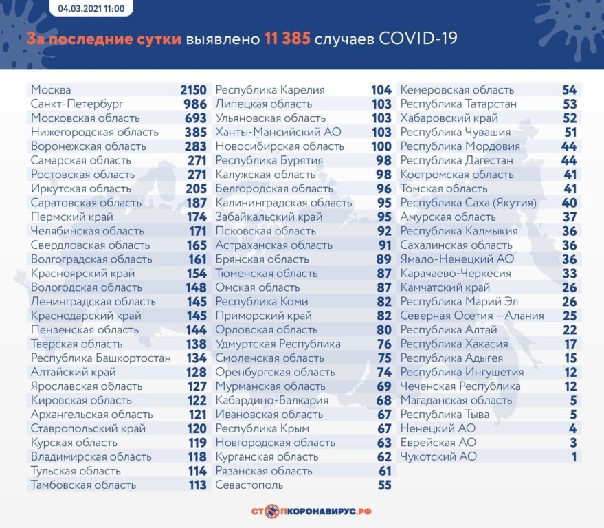 За последние сутки по состоянию на 4 марта 2021 года в России: