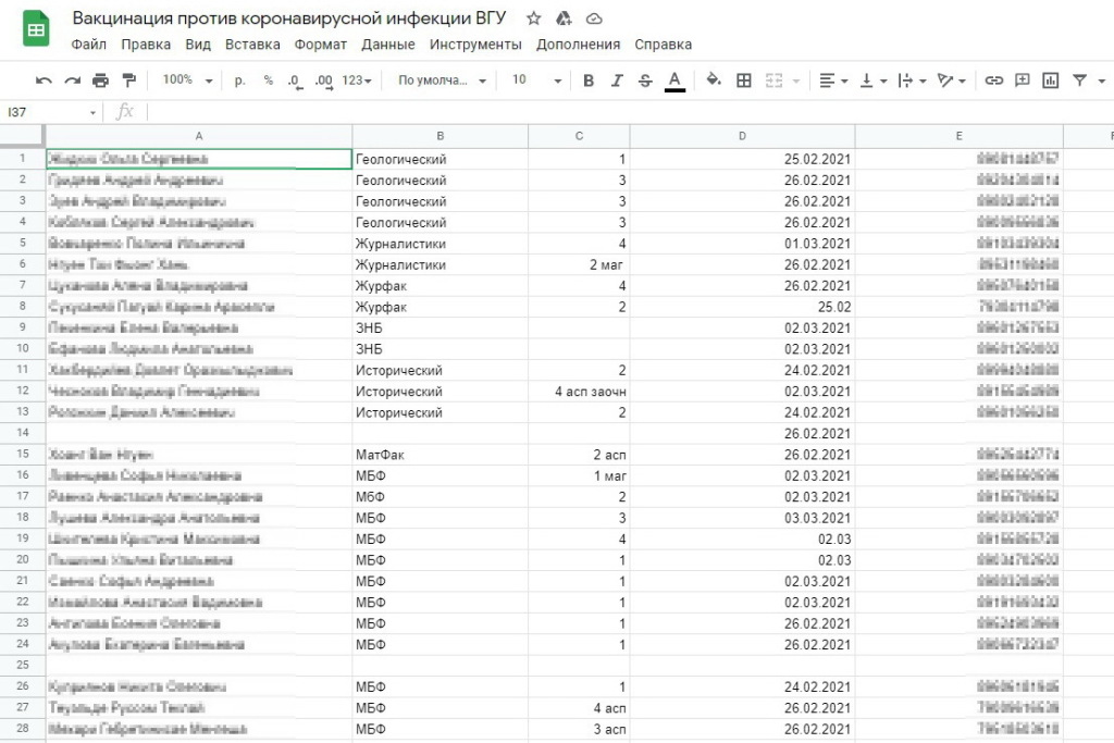 Воронежский государственный университет организует в главном корпусе (Университетская площадь, 1) вакцинацию студентов и сотрудников вуза от COVID-19. Прививки делали в конце февраля, 1 и 2 марта, дополнительные дни иммунизации объявлены на 9, 10 и 11 марта. В процессе записи студентов на процедуру номера их мобильных телефонов оказались в открытом доступе на официальной странице ВГУ во «ВКонтакте».