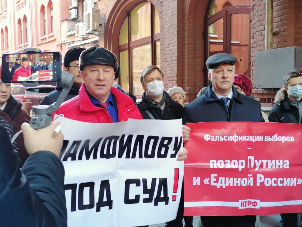 Депутат Госдумы от КПРФ Валерий Рашкин и другие представители партии потребовали отставки главы Центральной избирательной комиссии (ЦИК) Эллы Памфиловой. Они пришли с плакатами к зданию ЦИК.