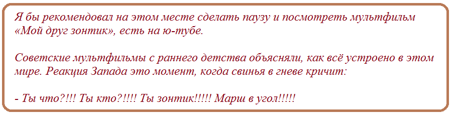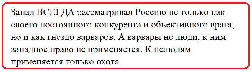 Запад вообще не понял наезда Путина. Вова, ты думал, ты нам ровня?! Ты кто?! Кровавая гэбня, сиди в своём малиннике и не суйся к благородным господам. Они искренне не поняли возмущения русских. Раз русские проиграли, они слуги, не больше. А группа Путина поняла, что они находятся не в компании благородных западных пиратов, а в компании русских фраеров.