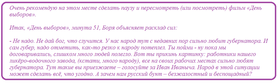 За 90-е и нулевые народ крепко сел на должности, все потоки поделили. Может, и не все довольны, но все согласны. И вот стоит вам начать двигать людей, как нарушается делёжка. Это же передел собственности, новая война. А «народ в этой ситуации может сделать всё, что угодно © Боря». То есть, возврат в 90-е. Ну и зачем главе государства топить народ в крови? И сейчас я говорю не о «народе» из фильма, под которым Боря подразумевает свою братву-уголовников, а о настоящем народе, который снова попадёт под раздачу.