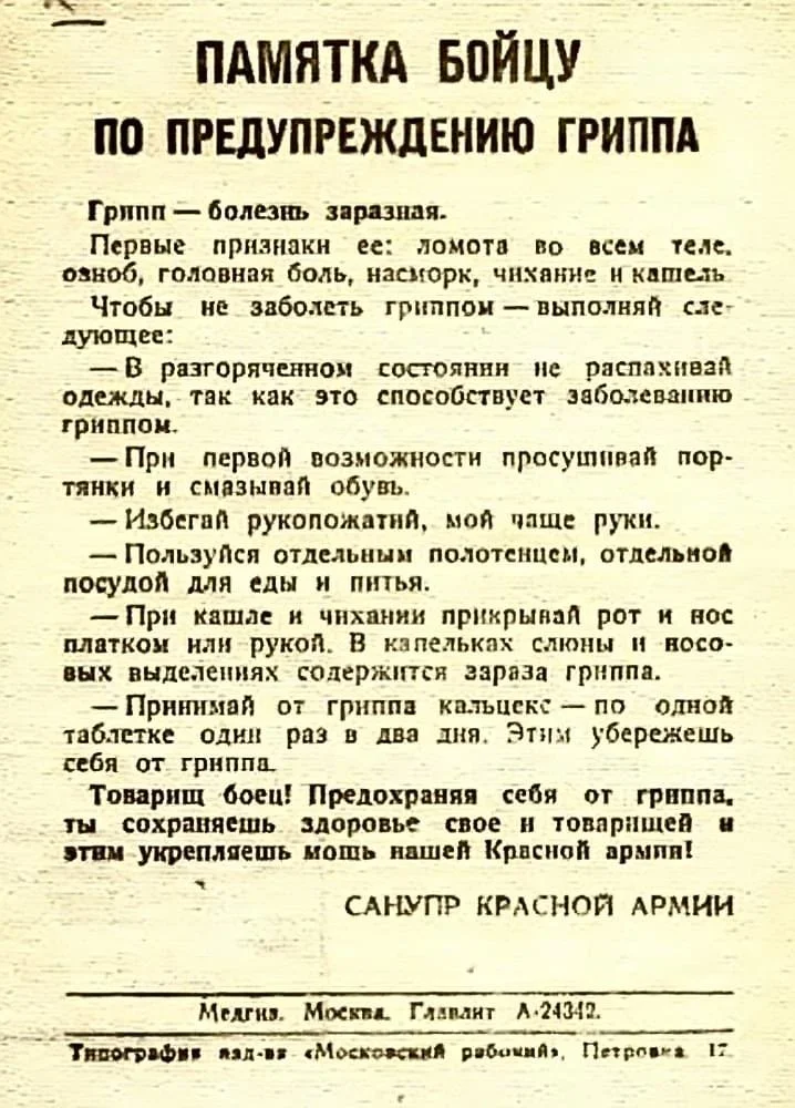 Признаки вражеского наступления были налицо – «ломота во всем теле, озноб, головная боль, насморк, чихание и кашель», — как о том предупреждало разведдонесение Санупра Красной Армии «Памятка бойцу по предупреждению гриппа».