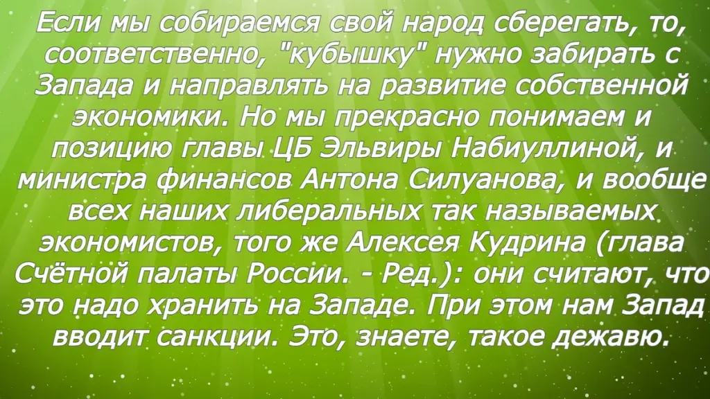 ФНБ в который Россия отправляет как бы излишки полученные от доходов от нефти. Все знают, что есть цифра отсечения. И всё, что получено "сверху" отправляем в заграницу. То есть, мы подпитываем экономику кого угодно, но не России.